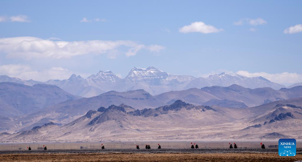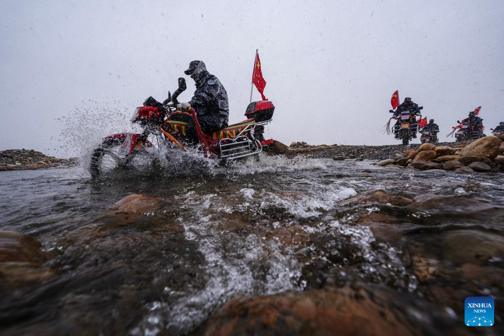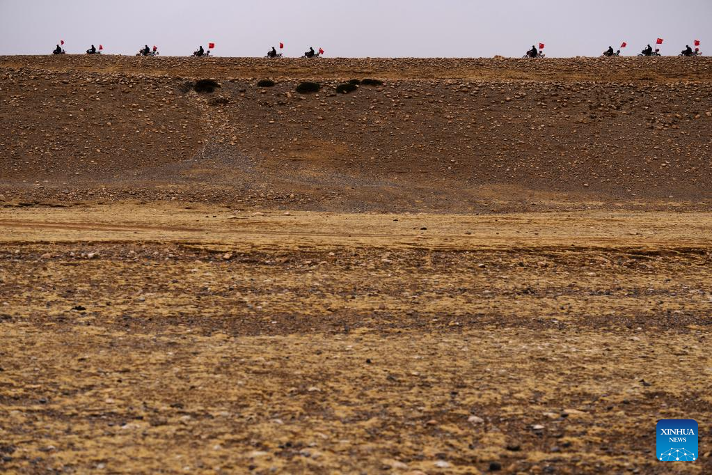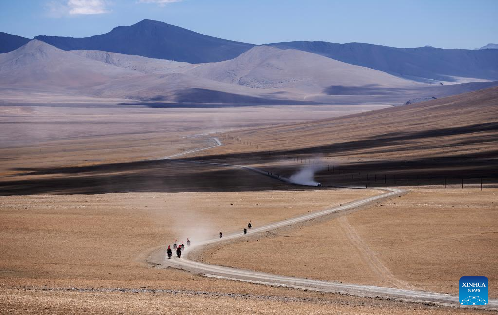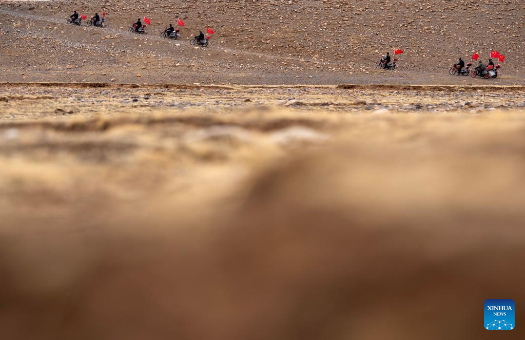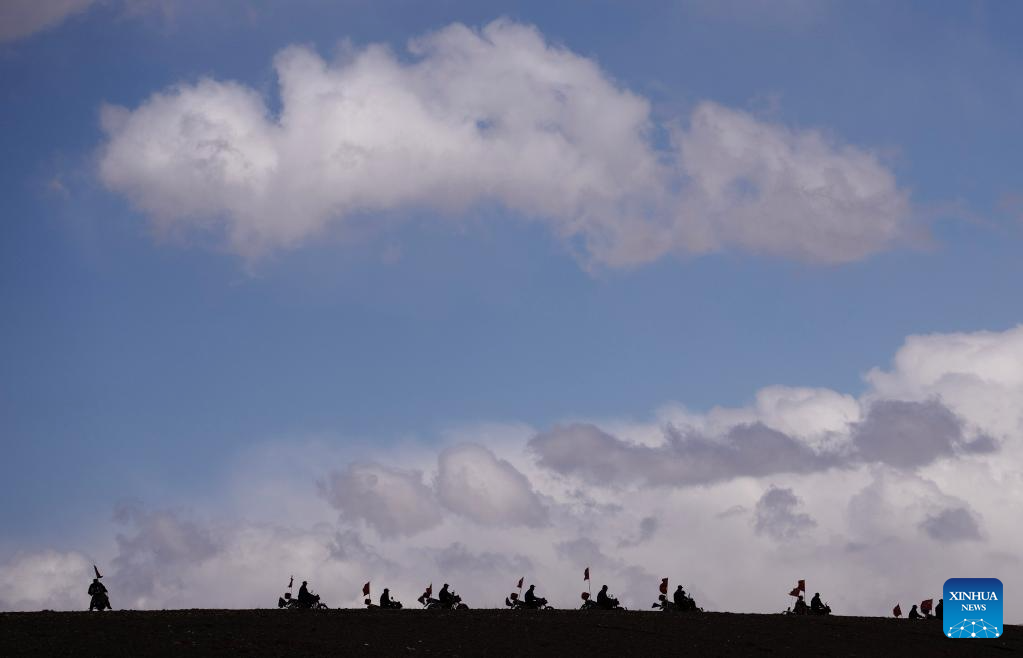 Members of the border defense team patrol on motorcycles in Changgo Township of Xigaze City, southwest China's Tibet Autonomous Region, June 2, 2023. Changgo Township, with an average elevation of over 5,000 meters, is a border township adjacent to Nepal with a 105-kilometer borderline. (Xinhua/Jigme Dorji)
