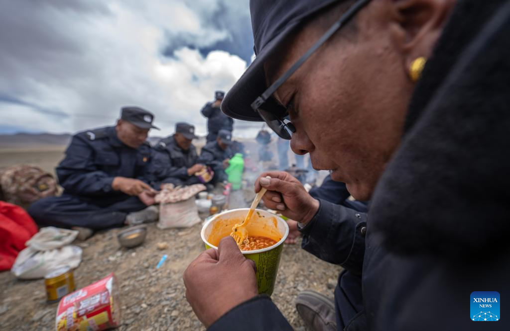Members of the border defense team prepare lunch in Changgo Township of Xigaze City, southwest China's Tibet Autonomous Region, June 2, 2023. Changgo Township, with an average elevation of over 5,000 meters, is a border township adjacent to Nepal with a 105-kilometer borderline. (Xinhua/Jigme Dorji)