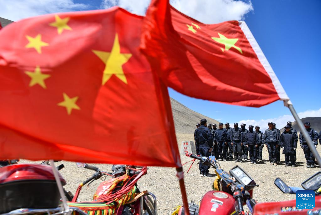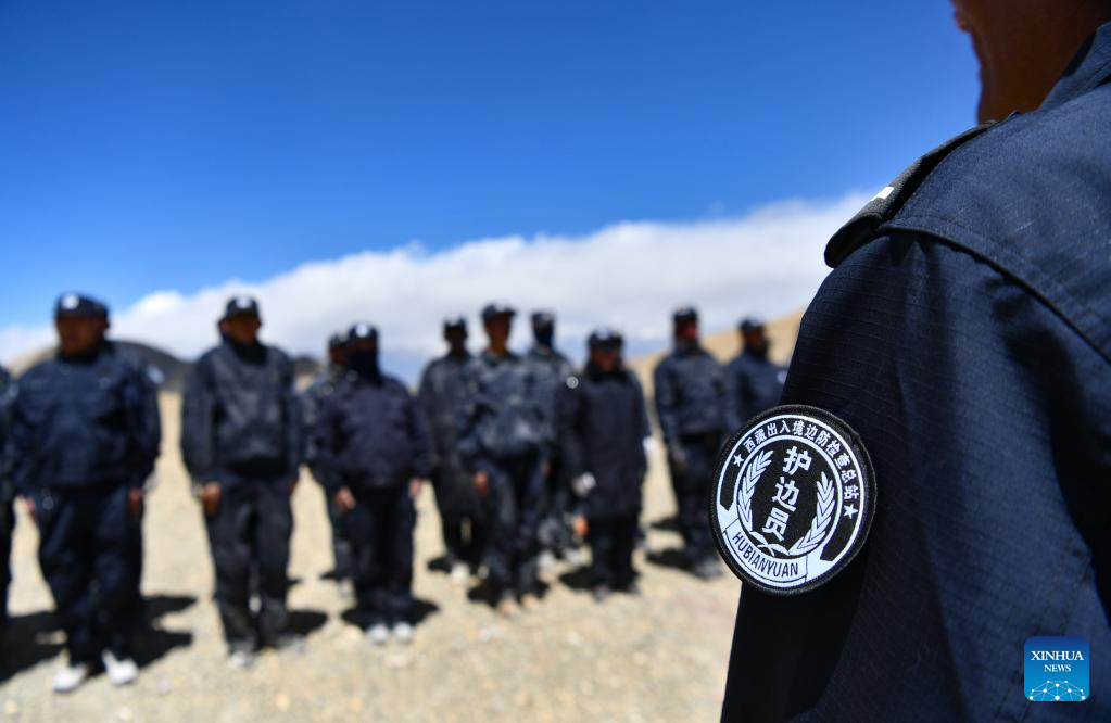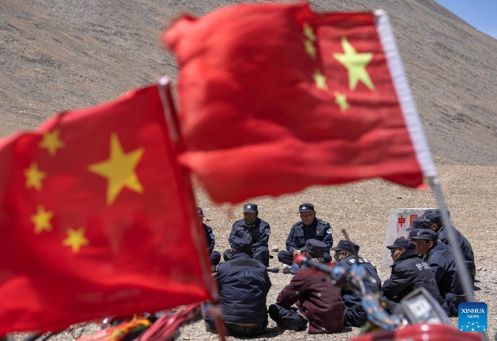 Members of the border defense team prepare to patrol at the No. 33 boundary marker in Changgo Township of Xigaze City, southwest China's Tibet Autonomous Region, June 2, 2023. Changgo Township, with an average elevation of over 5,000 meters, is a border township adjacent to Nepal with a 105-kilometer borderline. (Xinhua/Fei Maohua)