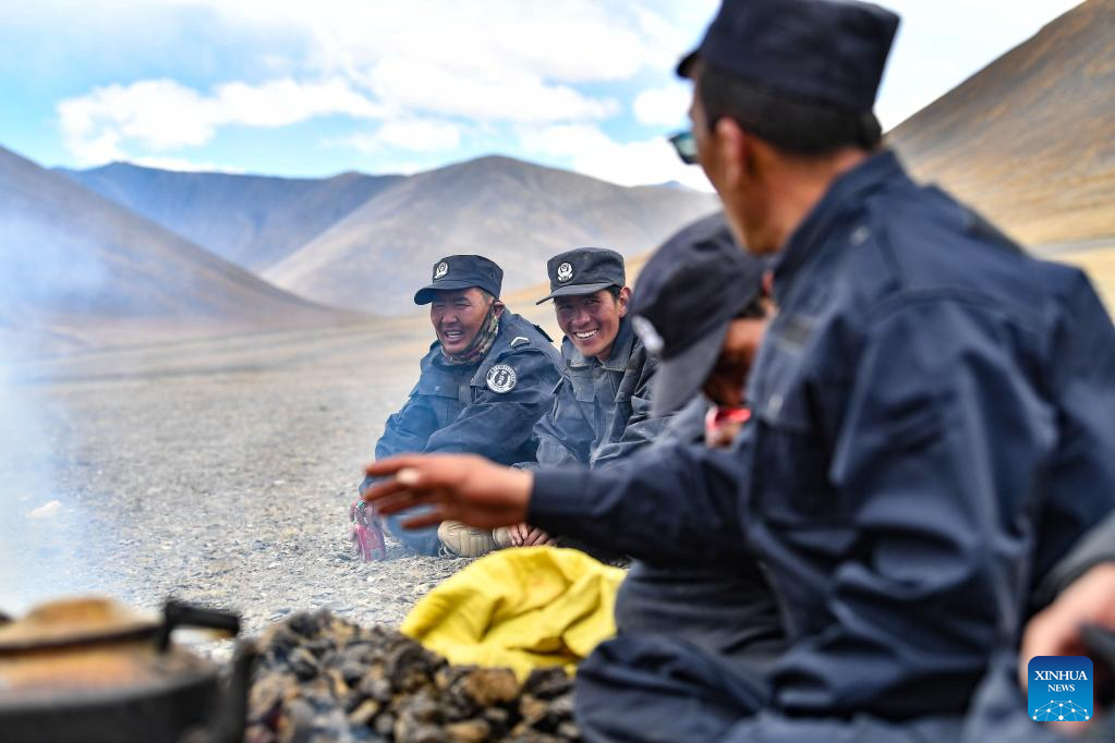 Members of the border defense team take a break in Changgo Township of Xigaze City, southwest China's Tibet Autonomous Region, June 2, 2023. Changgo Township, with an average elevation of over 5,000 meters, is a border township adjacent to Nepal with a 105-kilometer borderline. (Xinhua/Fei Maohua)