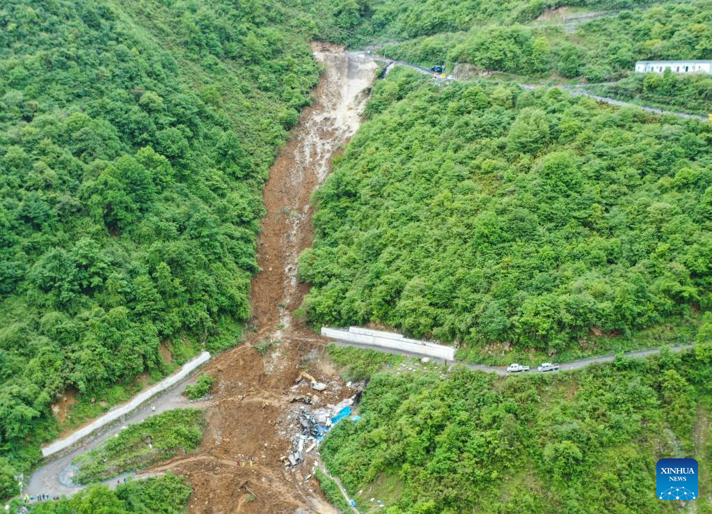 This aerial photo taken on June 4, 2023 shows the site of a mountain collapse at Yongsheng Township of Leshan City, southwest China's Sichuan Province. (Xinhua)