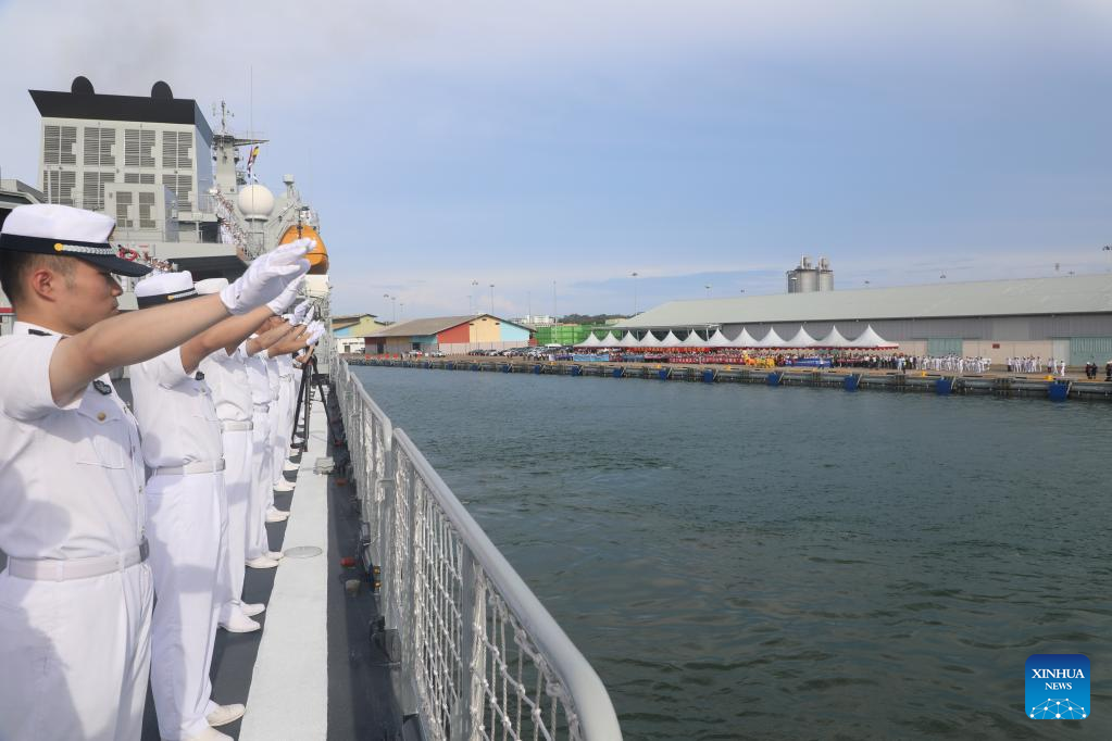 The Chinese naval members wave to the welcoming crowds at Muara Port in Brunei, June 5, 2023. (Xinhua)