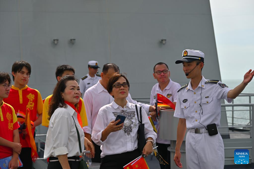 A Chinese navy member introduces Chinese naval training ship Qi Jiguang to visitors at Muara Port in Brunei, June 5, 2023. (Xinhua)