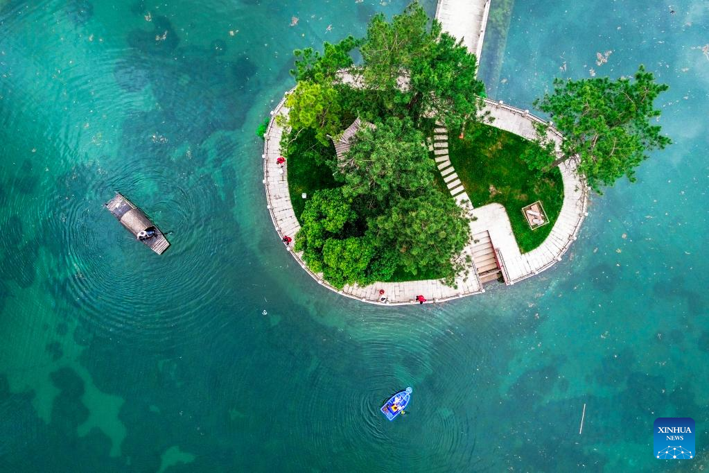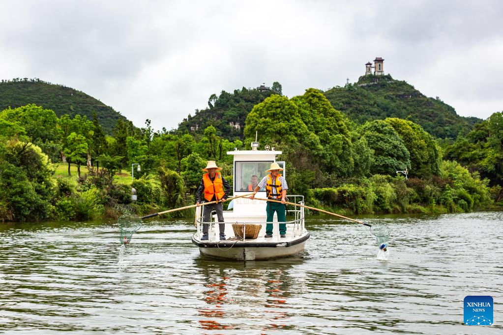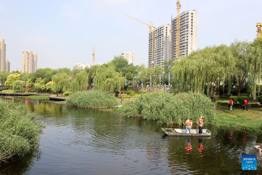 Workers clean the Hongshan Lake in Xixiu District of Anshun City, southwest China's Guizhou Province, on June 5, 2023. The World Environment Day 2023 falls on June 5, focusing on combating plastic pollution. People across China took action to protect the ecological environment in the county. (Photo by Chen Xi/Xinhua)