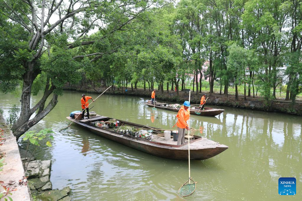 Workers clean the river at Pengjie Town in Luqiao District of Taizhou City, east China's Jiangsu Province, on June 5, 2023. The World Environment Day 2023 falls on June 5, focusing on combating plastic pollution. People across China took action to protect the ecological environment in the county. (Jiang Youqing/Xinhua)