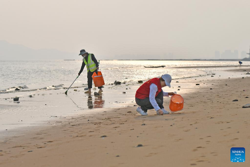Volunteers pick up garbage on the beach at Fushan District in Yantai City, east China's Shandong Province, on June 5, 2023. The World Environment Day 2023 falls on June 5, focusing on combating plastic pollution. People across China took action to protect the ecological environment in the county. (Photo by Sun Wentan/Xinhua)