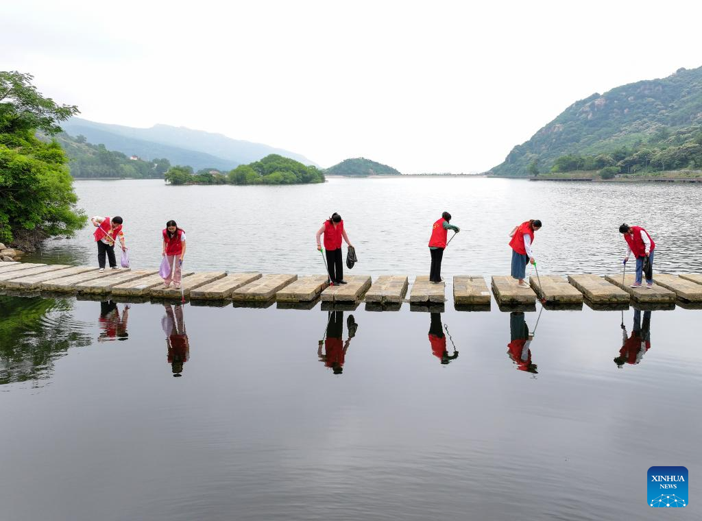 This aerial photo taken on June 5, 2023 shows volunteers picking up garbage at Tangwang Lake in Lianyungang City, east China's Jiangsu Province. The World Environment Day 2023 falls on June 5, focusing on combating plastic pollution. People across China took action to protect the ecological environment in the county. (Photo by Wang Jianmin/Xinhua)