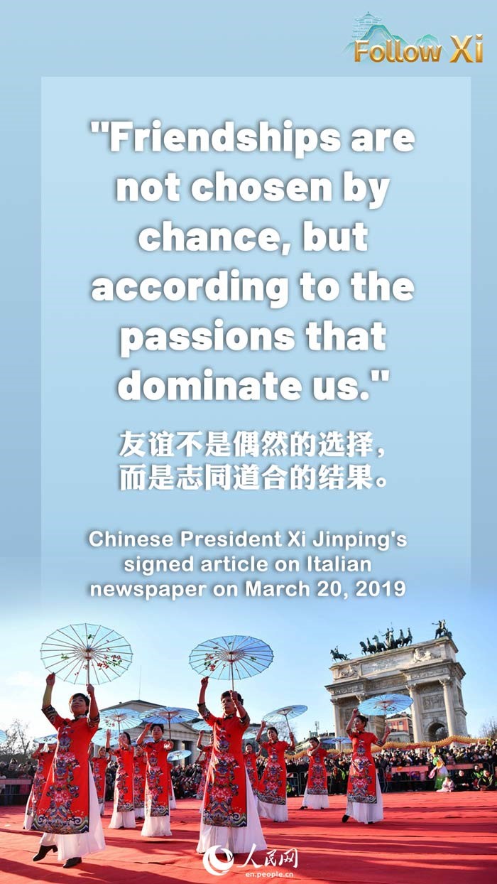 The well-known Italian writer Alberto Moravia once wrote, "Friendships are not chosen by chance, but according to the passions that dominate us." In a world that faces profound changes of a kind unseen in a century, the onus is on us to bring China-Italy relations to a higher level and to jointly safeguard world peace, stability, development and prosperity.