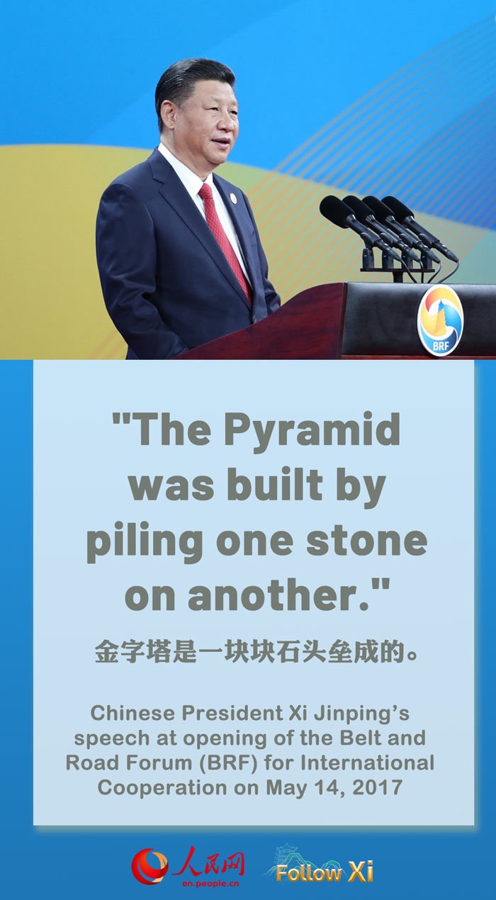 An ancient Chinese saying goes, "A long journey can be covered only by taking one step at a time". Similarly, there is an Arab proverb which says that the Pyramid was built by piling one stone on another. In Europe, there is also the saying that "Rome wasn’t built in a day." The Belt and Road Initiative is a great undertaking which requires dedicated efforts. Let us pursue this initiative step by step and deliver outcome one by one. By doing so, we will bring true benefit to both the world and all our people!