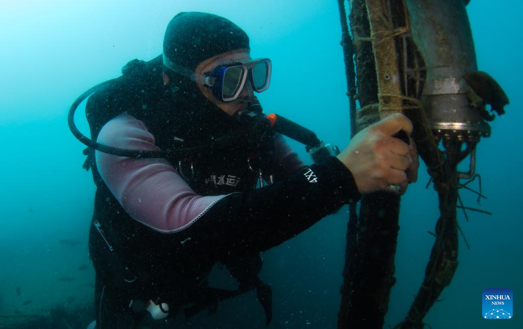 Wang Fengguo works underwater at a marine ranch in the sea area of Wuzhizhou Island in Sanya, south China's Hainan Province, March 28, 2020. (Xinhua/Yang Guanyu)
