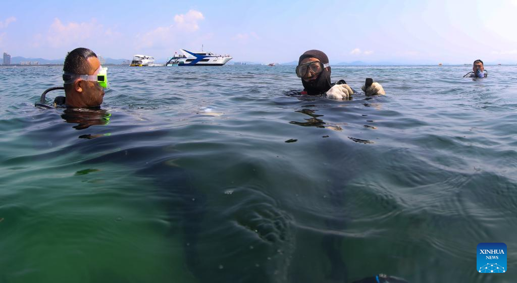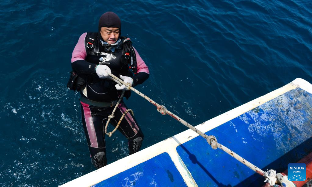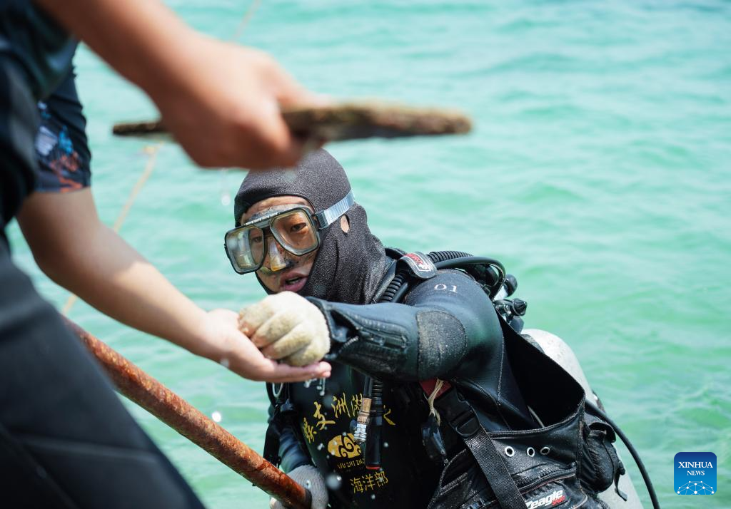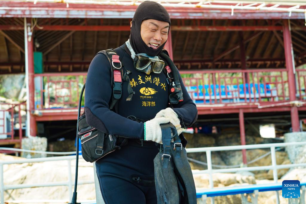Wang Fengguo prepares to work underwater at a marine ranch in the sea area of Wuzhizhou Island in Sanya, south China's Hainan Province, May 17, 2023. (Xinhua/Fan Yuqing)
