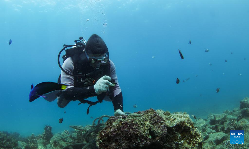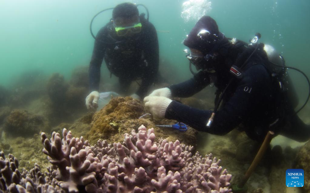 Wang Fengguo (R) transplants corals at a marine ranch in the sea area of Wuzhizhou Island in Sanya, south China's Hainan Province, May 17, 2023. (Xinhua/Yang Guanyu)
