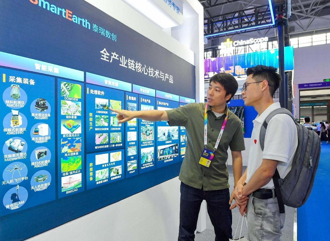 An employee of an exhibitor introduces technologies and products to a visitor at the China International Big Data Industry Expo 2023 in Guiyang, southwest China's Guizhou province, May 26, 2023. (People's Daily Online/Jia Zhi)
