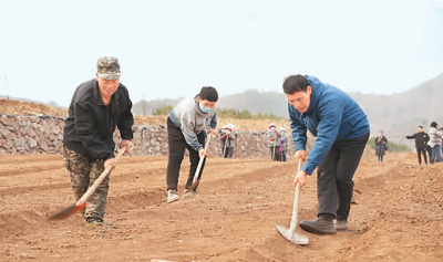 Zuo Songtao (R), first Party secretary of Xiayingzi village in north China's Hebei Province, works with villagers. (Photo courtesy of the Publicity Department of the Communist Party of China Luanping County Committee)