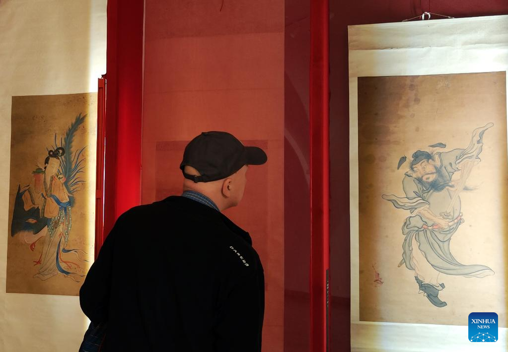 A visitor looks at a painting at a Chinese painting exhibition in Vilnius, Lithuania, June 7, 2023. The exhibition, which displays over 100 pieces of Chinese paintings, will last until Sept. 3. (Photo by Yang Weihua/Xinhua)