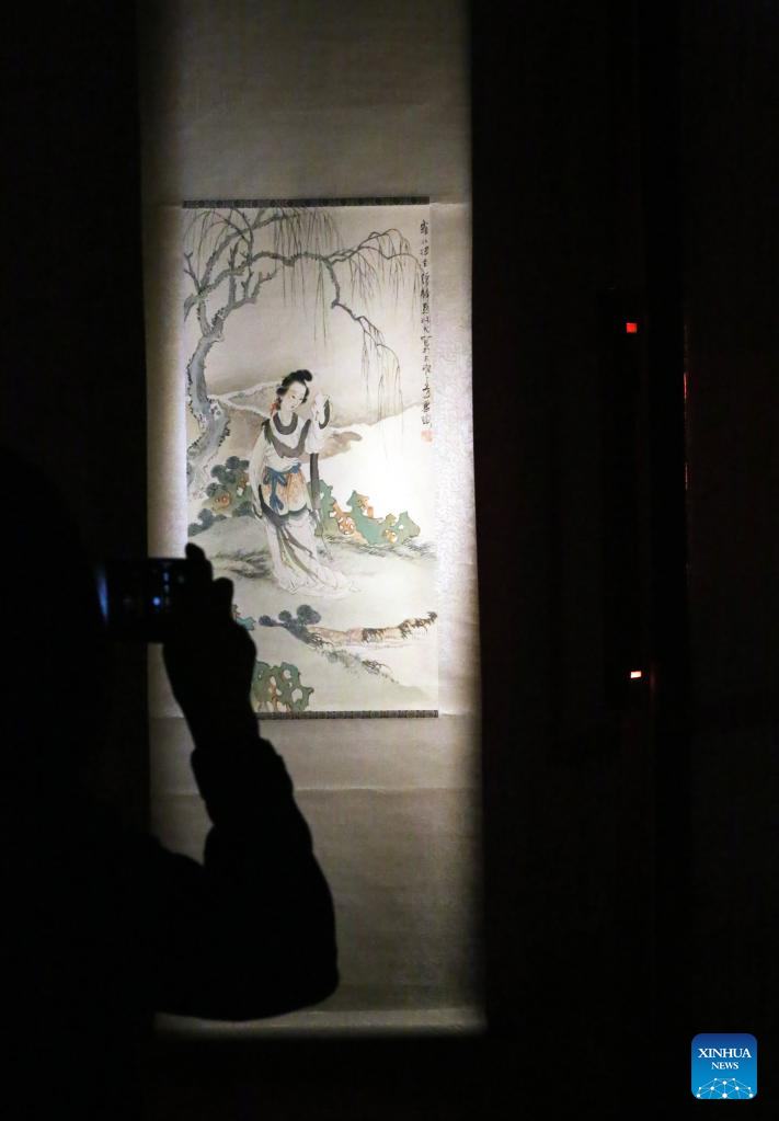A visitor takes photos of a painting at a Chinese painting exhibition in Vilnius, Lithuania, June 7, 2023. The exhibition, which displays over 100 pieces of Chinese paintings, will last until Sept. 3. (Photo by Yang Weihua/Xinhua)