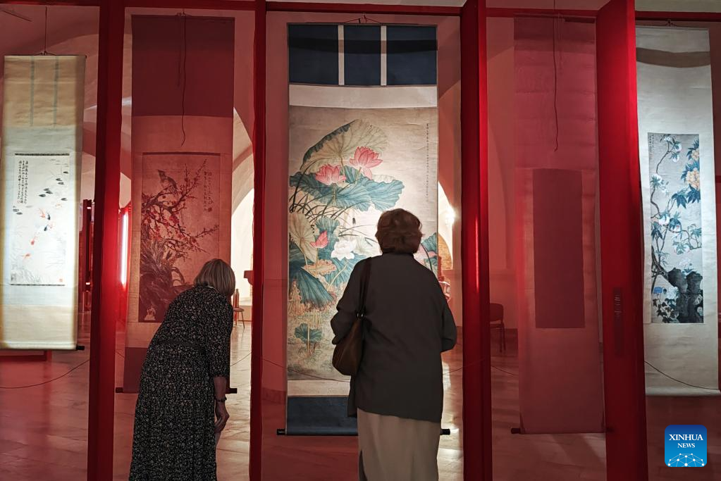 Visitors look at paintings at a Chinese painting exhibition in Vilnius, Lithuania, June 7, 2023. The exhibition, which displays over 100 pieces of Chinese paintings, will last until Sept. 3. (Photo by Yang Weihua/Xinhua)