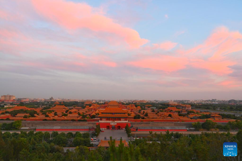 This photo taken on June 7, 2023 shows the view of sunset glow over the Palace Museum in Beijing, capital of China. (Xinhua/Chen Yehua)