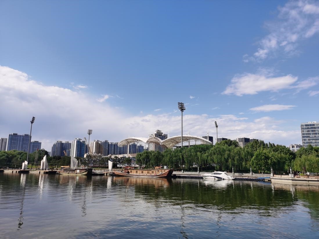 Under the blue sky in Linfen, north China's Shanxi province, people are working out in the fresh air along the ancient city walls and Fenhe River.