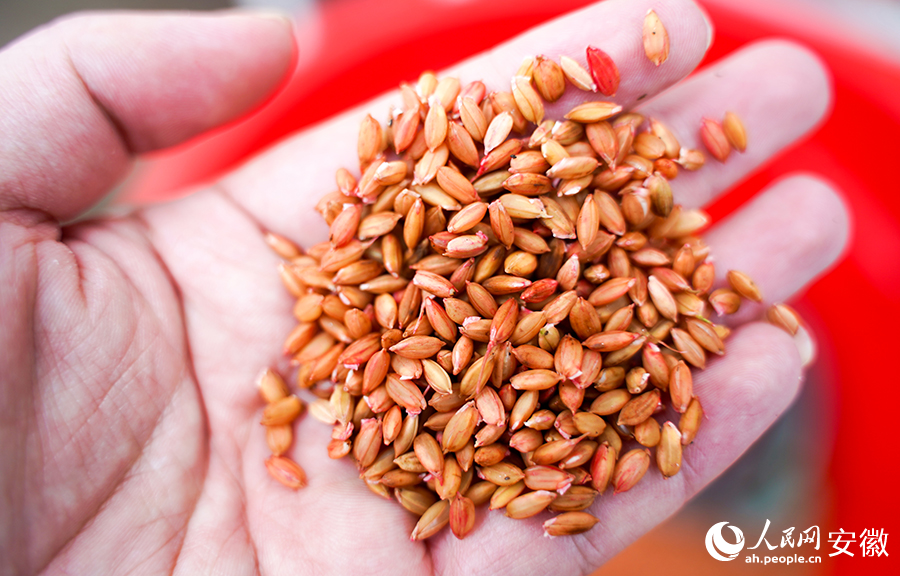 A worker shows rice seeds at an intelligent seedling cultivation center in the Munan agricultural industrial park in Jin'an district, Lu'an city, east China's Anhui Province. (People's Daily Online/Wang Rui)