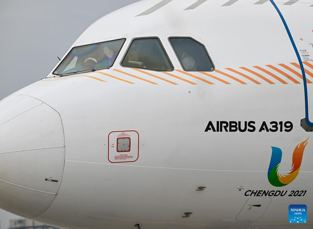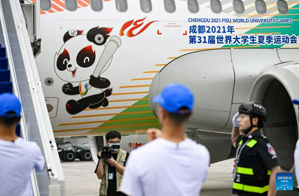 Photo taken on June 8, 2023 shows the plane carrying the World University Games flame at the Chengdu Tianfu International Airport in Chengdu, southwest China's Sichuan Province. (Xinhua/Wang Xi)