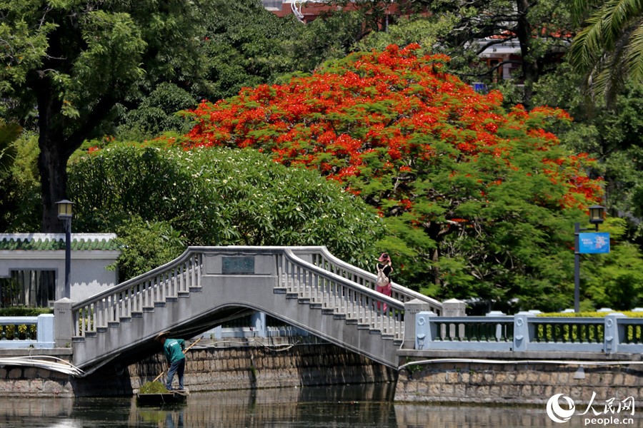 Flowering flame trees and lush green trees of other species form a delightful contrast in Zhongshan Park in Xiamen city, southeast China's Fujian Province. (People's Daily Online/Chen Bo)
