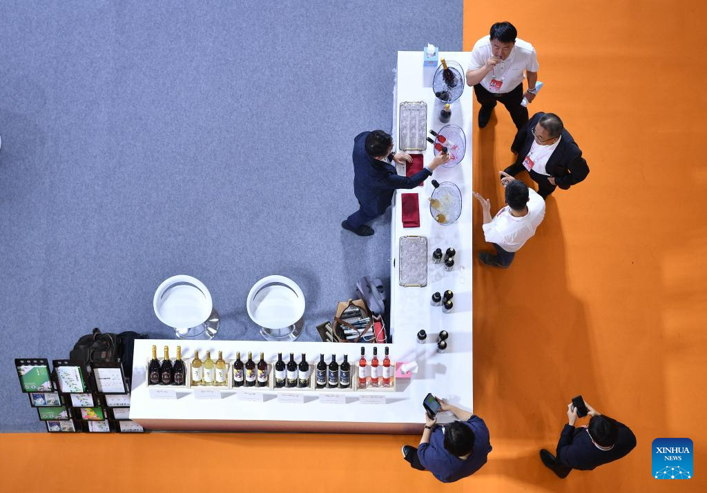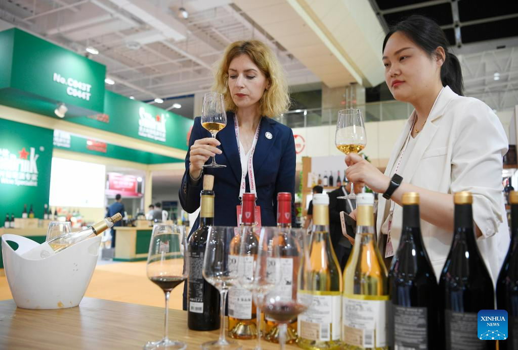 People taste wine during a wine-themed international conference and an expo in Yinchuan, northwest China's Ningxia Hui Autonomous Region, June 9, 2023. (Xinhua/Wang Peng)