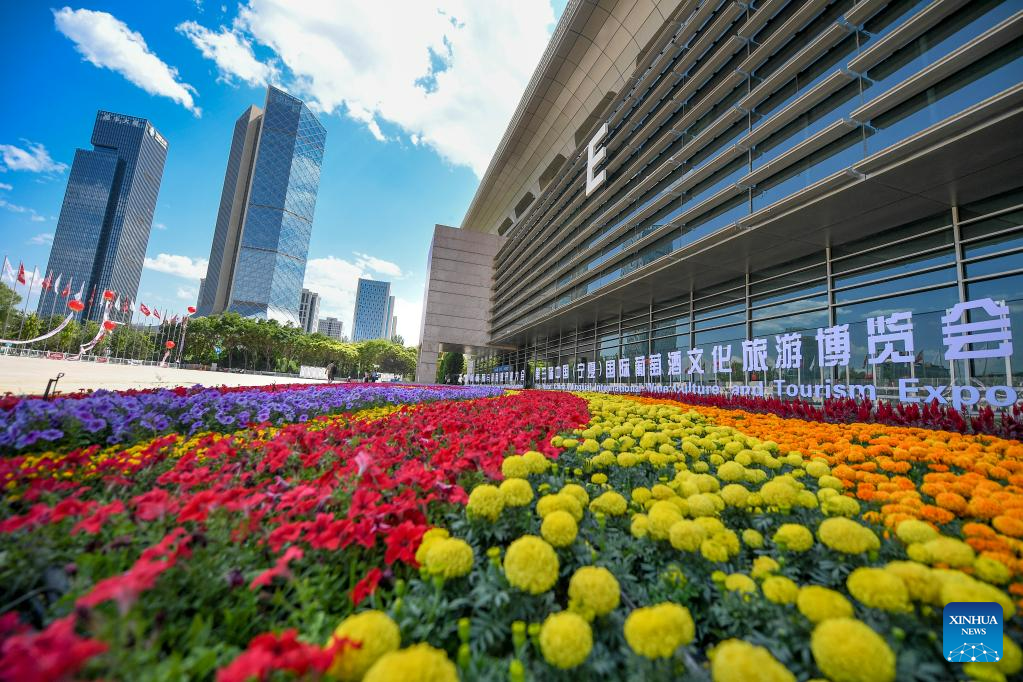 This photo taken on June 9, 2023 shows an exterior view of the venue of a wine-themed international conference and an expo in Yinchuan, northwest China's Ningxia Hui Autonomous Region. (Xinhua/Feng Kaihua)