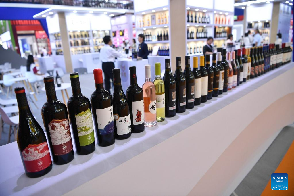 Bottles of wine are seen during a wine-themed international conference and an expo in Yinchuan, northwest China's Ningxia Hui Autonomous Region, June 9, 2023. (Xinhua/Wang Peng)