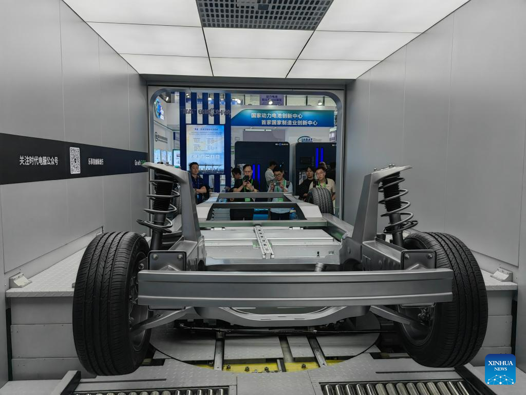 Visitors look at a power battery swap system for new energy vehicles on an exhibition of the 2023 World Power Battery Conference in Yibin, southwest China's Sichuan Province, June 9, 2023. Themed "New Green Power for the Future and New Growth-driver for the World", the 2023 World Power Battery Conference kicked off here on Friday. (Xinhua/Hu Xu)