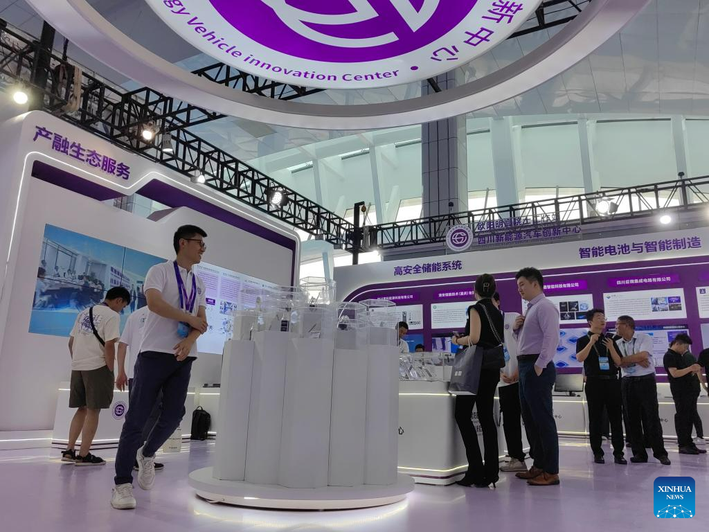 Visitors learn about innovation achievements of new energy vehicles on an exhibition of the 2023 World Power Battery Conference in Yibin, southwest China's Sichuan Province, June 9, 2023. Themed "New Green Power for the Future and New Growth-driver for the World", the 2023 World Power Battery Conference kicked off here on Friday. (Xinhua/Hu Xu)