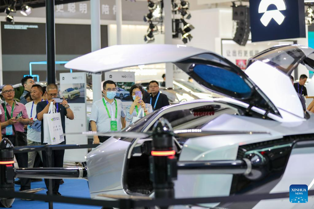 Visitors look at a domestic air vehicle on an exhibition of the 2023 World Power Battery Conference in Yibin, southwest China's Sichuan Province, June 9, 2023. Themed "New Green Power for the Future and New Growth-driver for the World", the 2023 World Power Battery Conference kicked off here on Friday. (Photo by Zhuang Ge'er/Xinhua)