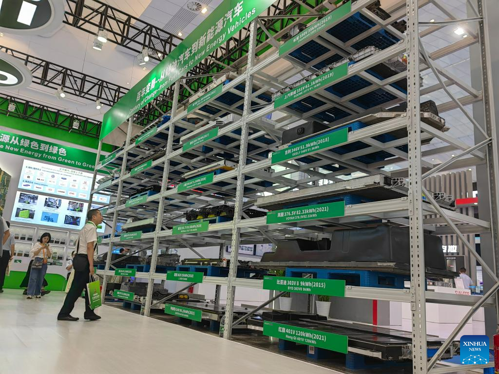 Recycled power batteries of new energy vehicles are on display during an exhibition of the 2023 World Power Battery Conference in Yibin, southwest China's Sichuan Province, June 9, 2023. Themed "New Green Power for the Future and New Growth-driver for the World", the 2023 World Power Battery Conference kicked off here on Friday. (Xinhua/Hu Xu)
