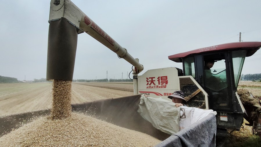 A villager drives a harvester to load wheat onto a truck in Beixinzhuang Village of Xiangfu District, Kaifeng City, central China's Henan Province, June 7, 2023. (Photo by Li Junsheng/Xinhua)
