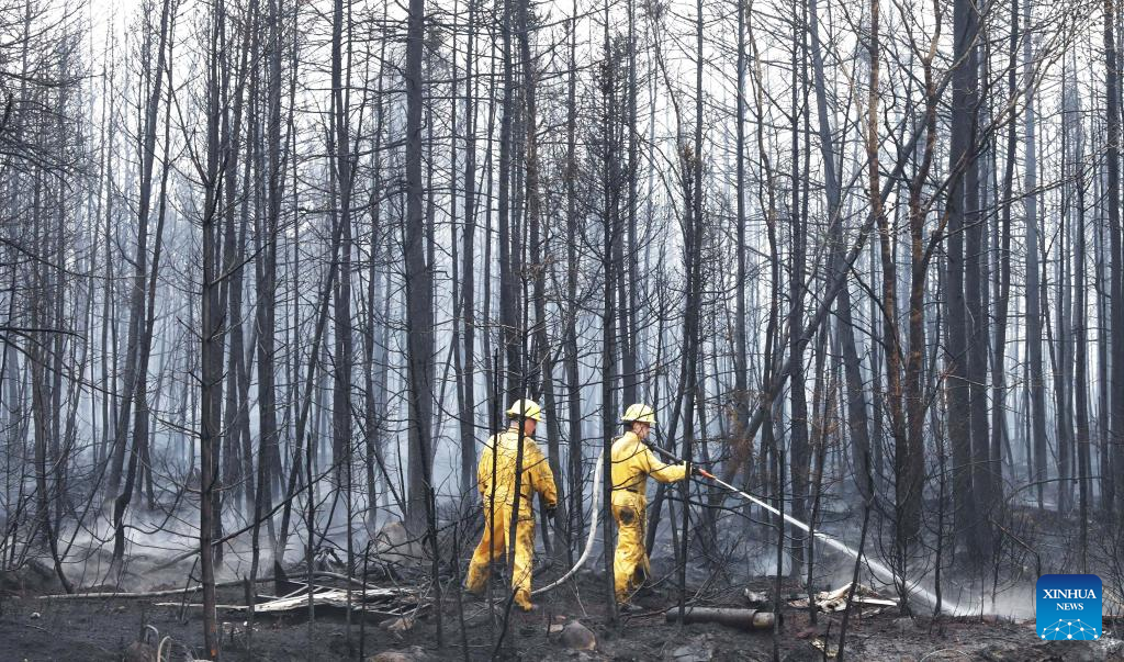 Firefighters spray hot spots in Shelburne County, Nova Scotia, Canada, on June 3, 2023. With more than nine million acres of land burnt, over 20,000 residents evacuated and at least 400 fires still active, half of which are believed out of control, a staggering series of figures revealed on Wednesday by Canadian Minister of Emergency Preparedness Bill Blair showed that the country is facing an unprecedented battle against the raging wildfires. (Nova Scotia Government/Handout via Xinhua)