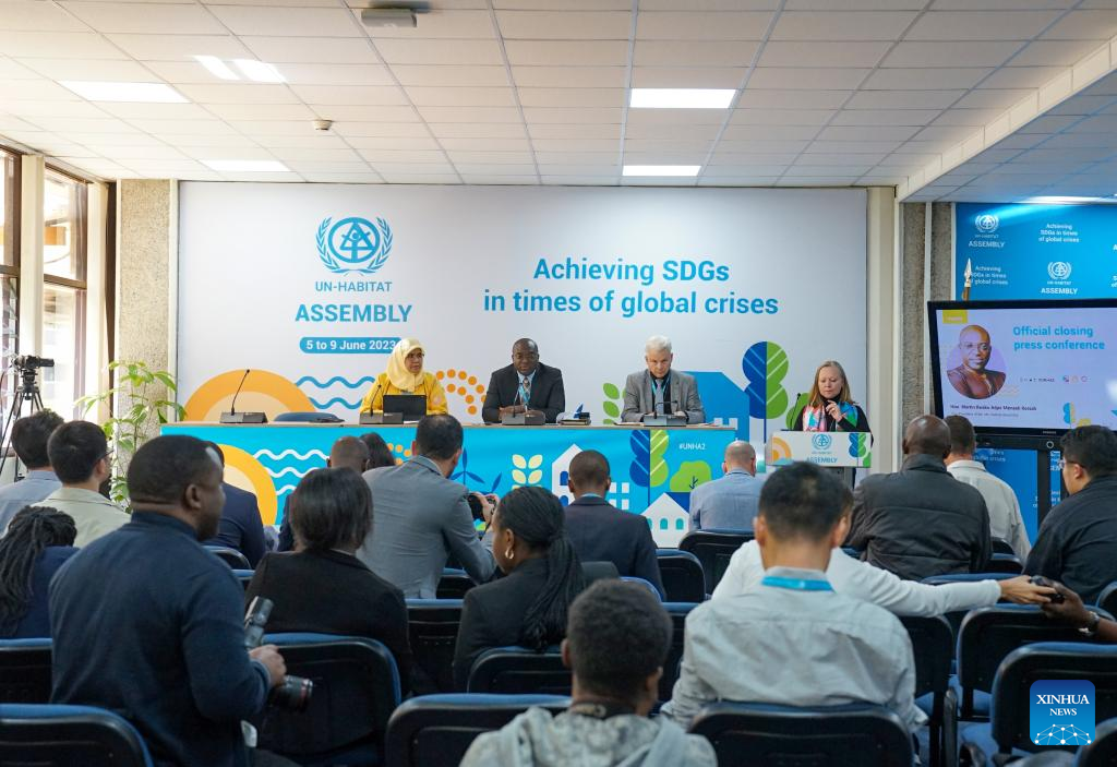 Photo taken on June 9, 2023 shows the closing press conference of the second session of the United Nations Habitat assembly in Nairobi, Kenya. The second session of the United Nations Habitat assembly ended Friday with delegates resolving to inject fresh impetus into ongoing efforts to renew cities that host more than 50 percent of the global population. (Xinhua/Li Yahui)