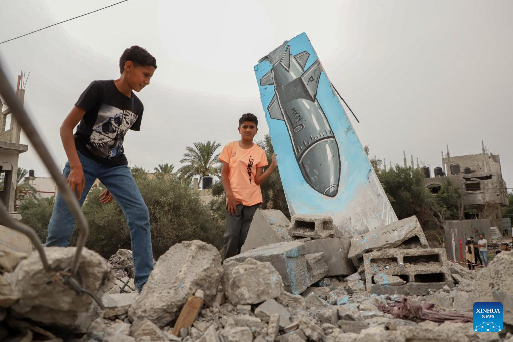 Palestinian children are seen in front of an artwork during an art exhibition in Deir al-Balah refugee camp in central Gaza Strip, on June 8, 2023. Dozens of Palestinian artists in Gaza on Thursday took part in the art exhibition to reflect the suffering of the local children during the Gaza-Israeli tensions. (Photo by Rizek Abdeljawad/Xinhua)