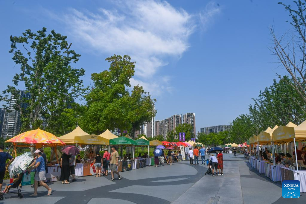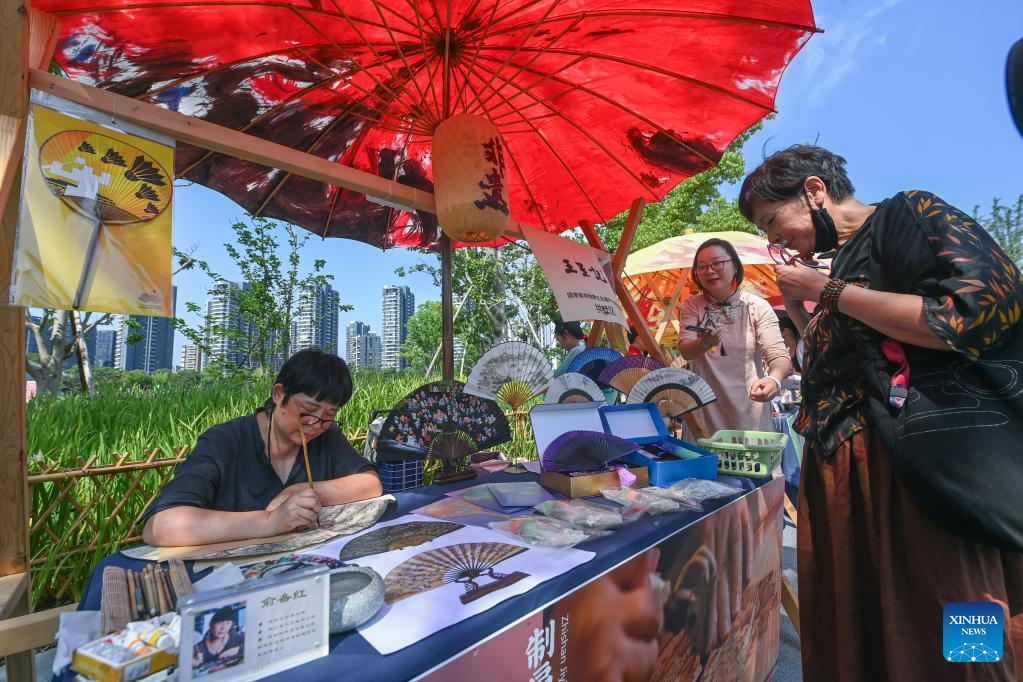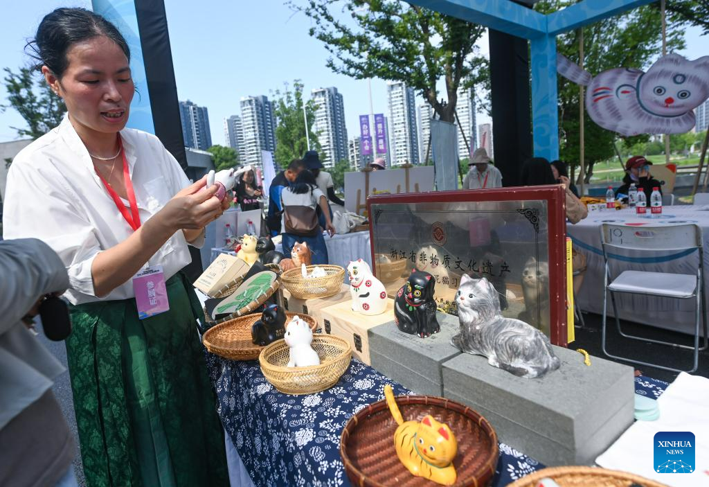 Intangible cultural heritages and relevant products are exhibited during an activity marking the upcoming Cultural and Natural Heritage Day in Hangzhou, east China's Zhejiang Province, June 9, 2023. A series of activities in celebration of the upcoming Cultural and Natural Heritage Day were held at the Gongshu Canal Sports Park in Hangzhou, showcasing 66 Chinese intangible cultural heritages which are inscribed at UNESCO, national, provincial, municipal or district levels. (Xinhua/Xu Yu)