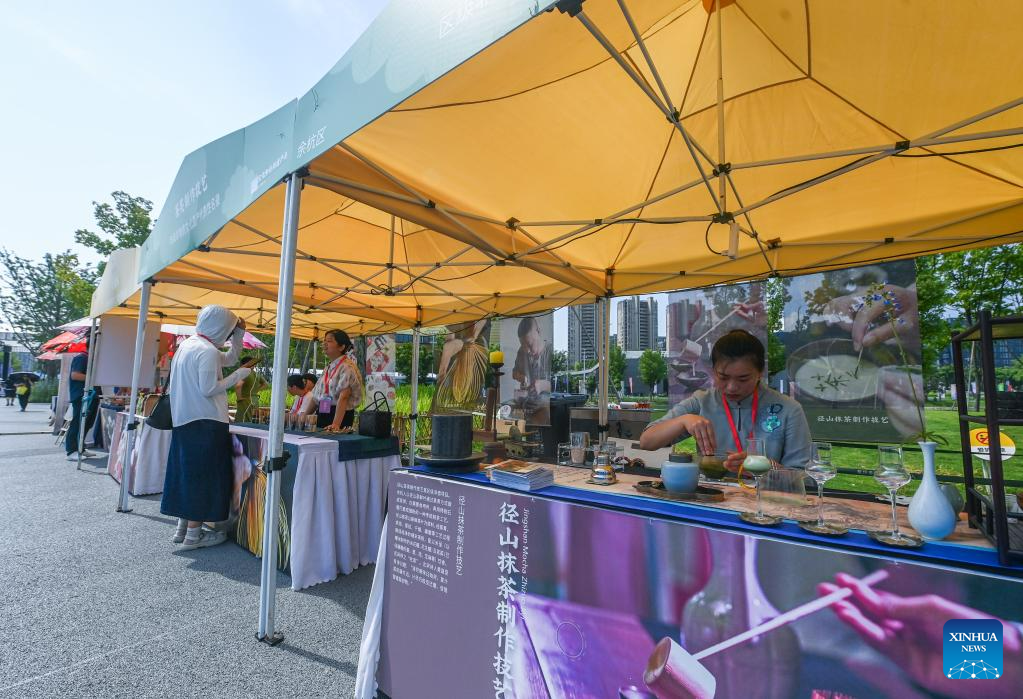 Actors perform the Jingshan tea ceremony, a national-level intangible cultural heritage, during an activity marking the upcoming Cultural and Natural Heritage Day in Hangzhou, east China's Zhejiang Province, June 9, 2023. A series of activities in celebration of the upcoming Cultural and Natural Heritage Day were held at the Gongshu Canal Sports Park in Hangzhou, showcasing 66 Chinese intangible cultural heritages which are inscribed at UNESCO, national, provincial, municipal or district levels. (Xinhua/Xu Yu)