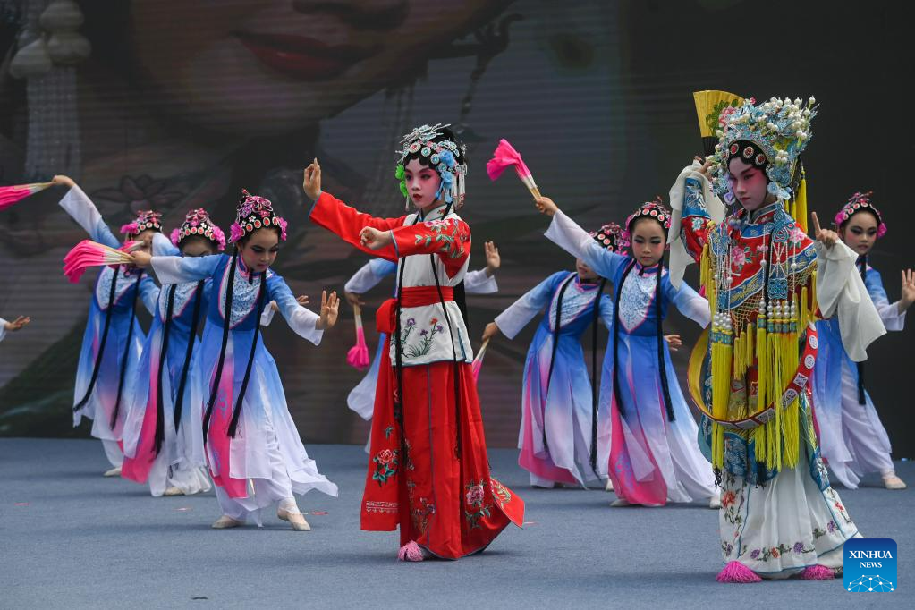 Actors perform a Chinese opera on stage during an activity marking the upcoming Cultural and Natural Heritage Day in Hangzhou, east China's Zhejiang Province, June 9, 2023. A series of activities in celebration of the upcoming Cultural and Natural Heritage Day were held at the Gongshu Canal Sports Park in Hangzhou, showcasing 66 Chinese intangible cultural heritages which are inscribed at UNESCO, national, provincial, municipal or district levels. (Xinhua/Xu Yu)