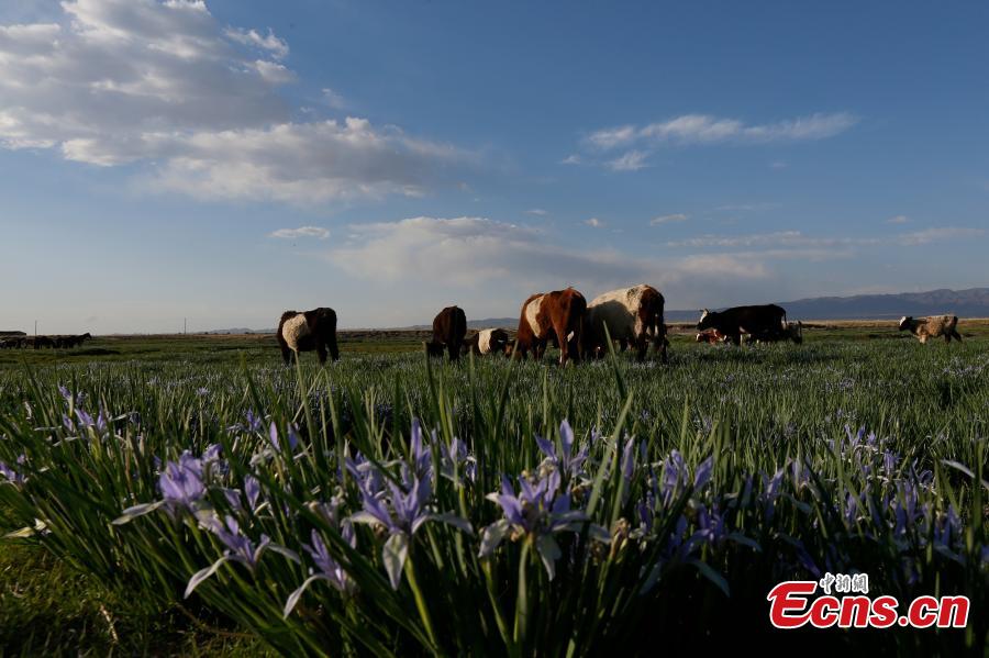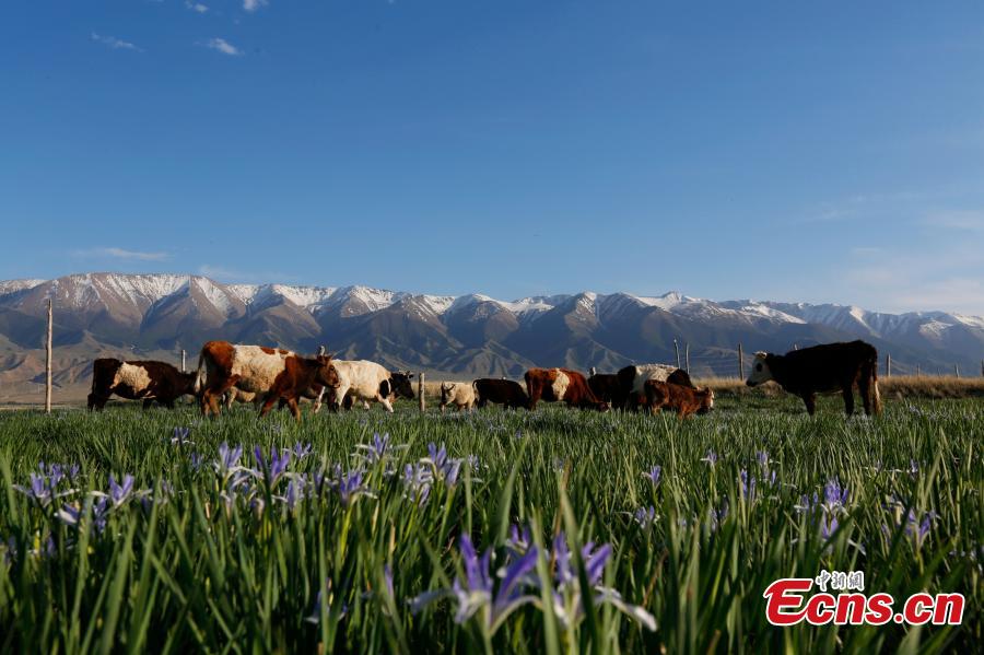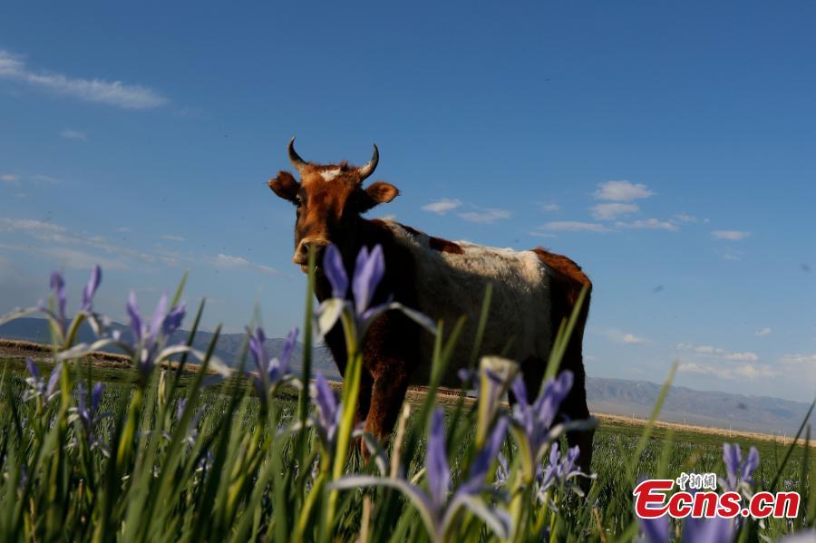 Cattle forage on a grassland with blooming iris lactea flowers in northwest China's Xinjiang Uyghur Autonomous Region. (Photo/China News Service)