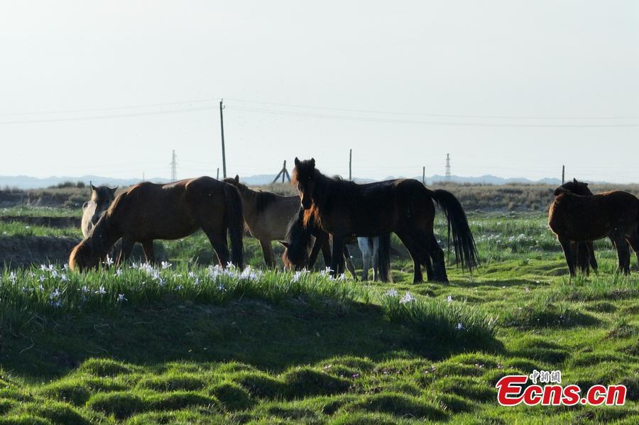 Horses forage on a grassland with blooming iris lactea flowers in northwest China's Xinjiang Uyghur Autonomous Region. (Photo/China News Service)