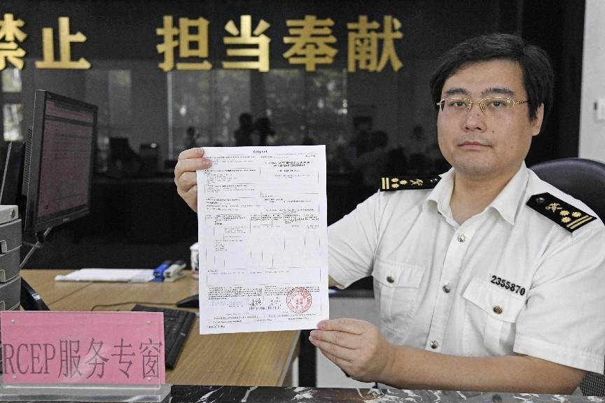 A customs official from Changzhou, east China's Jiangsu province, shows the province's first RCEP certificate of origin for exports to the Philippines, June 2. (People's Daily Online/Xia Chenxi)
