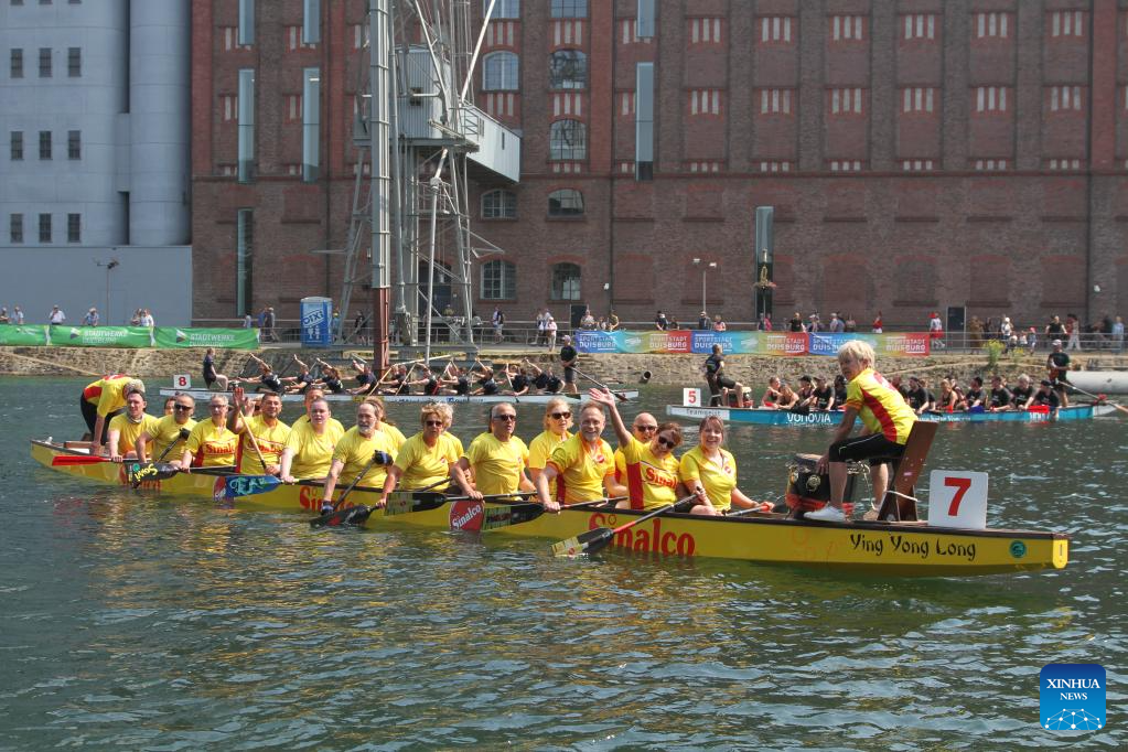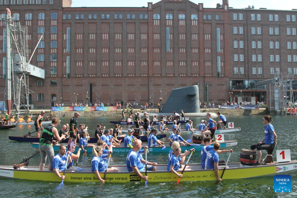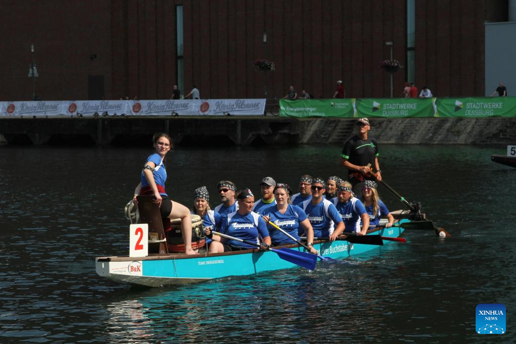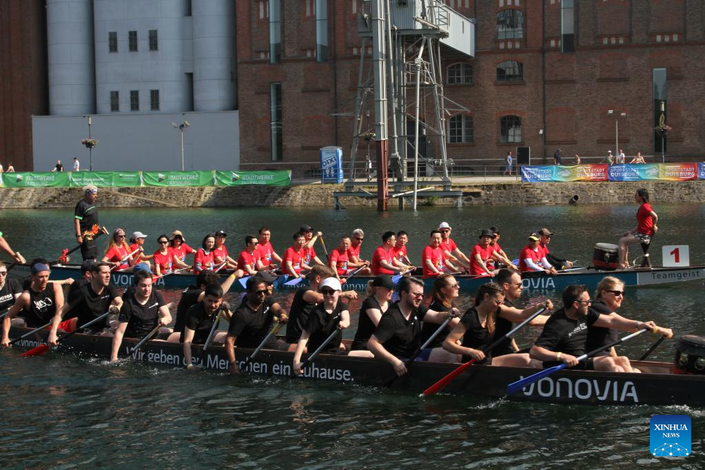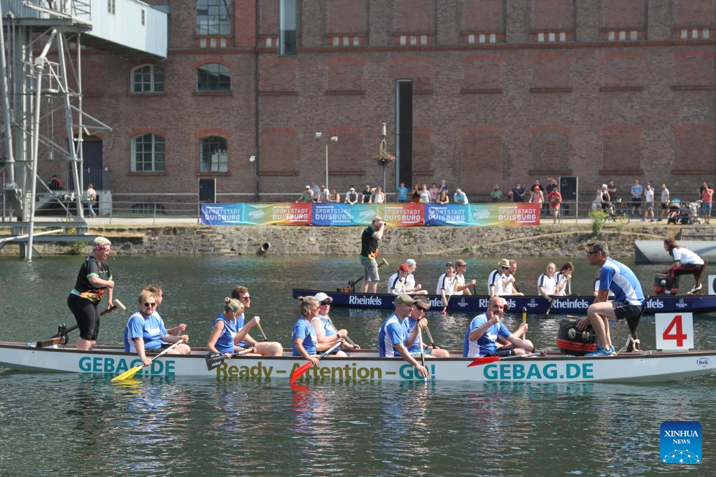 Rowing teams participate in a dragon boat race at the Inner Harbour of Duisburg, Germany, June 10, 2023. The 2023 Duisburg Dragon Boat Race took place from June 9 to 11, attracting around 140 teams and 3,000 competitors and offering local residents an opportunity to learn about Chinese culture and festival traditions. (Xinhua/Shan Weiyi)
