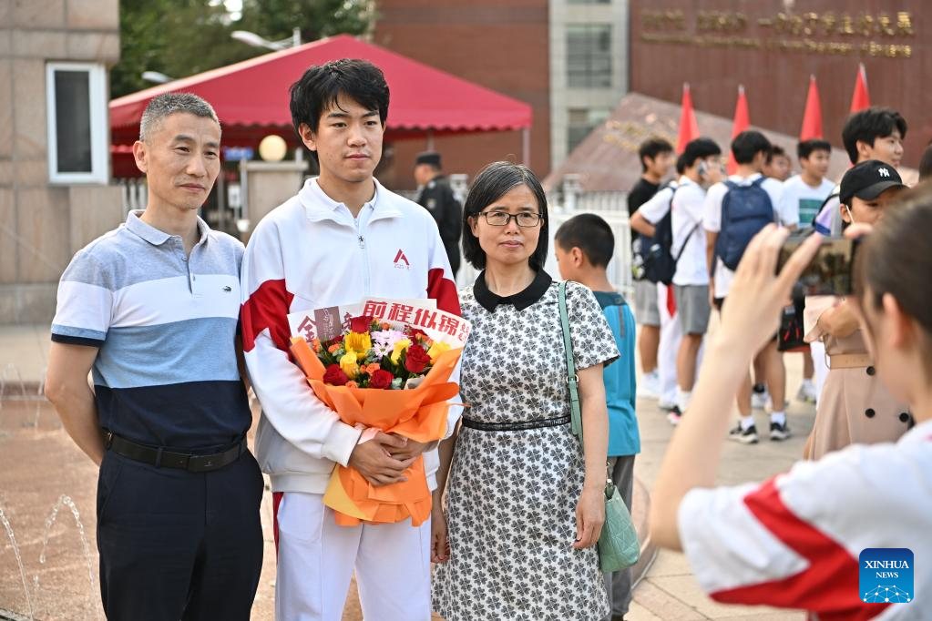 An examinee poses for photos with his parents at an exam site in Beijing, capital of China, June 10, 2023.