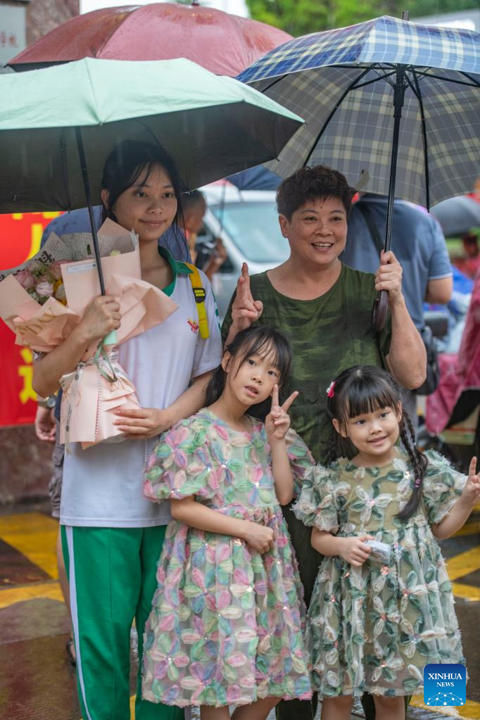 An examinee poses for photos with her family at an exam site in Qionghai City, south China's Hainan Province, June 10, 2023.