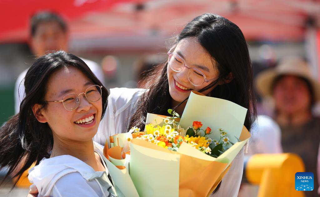An examinee (L) is presented with flowers by her friend at an exam site in Tengzhou City, east China's Shandong Province, June 10, 2023.