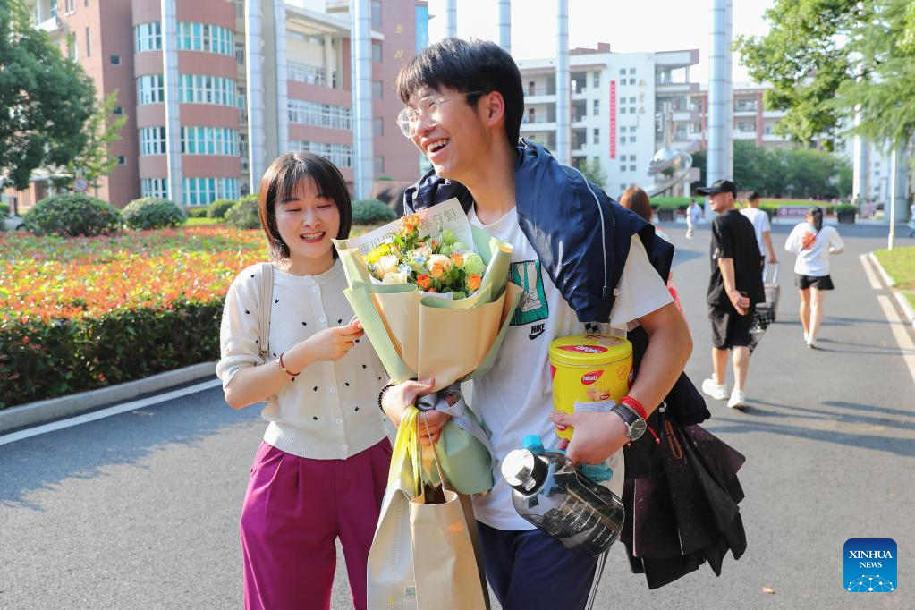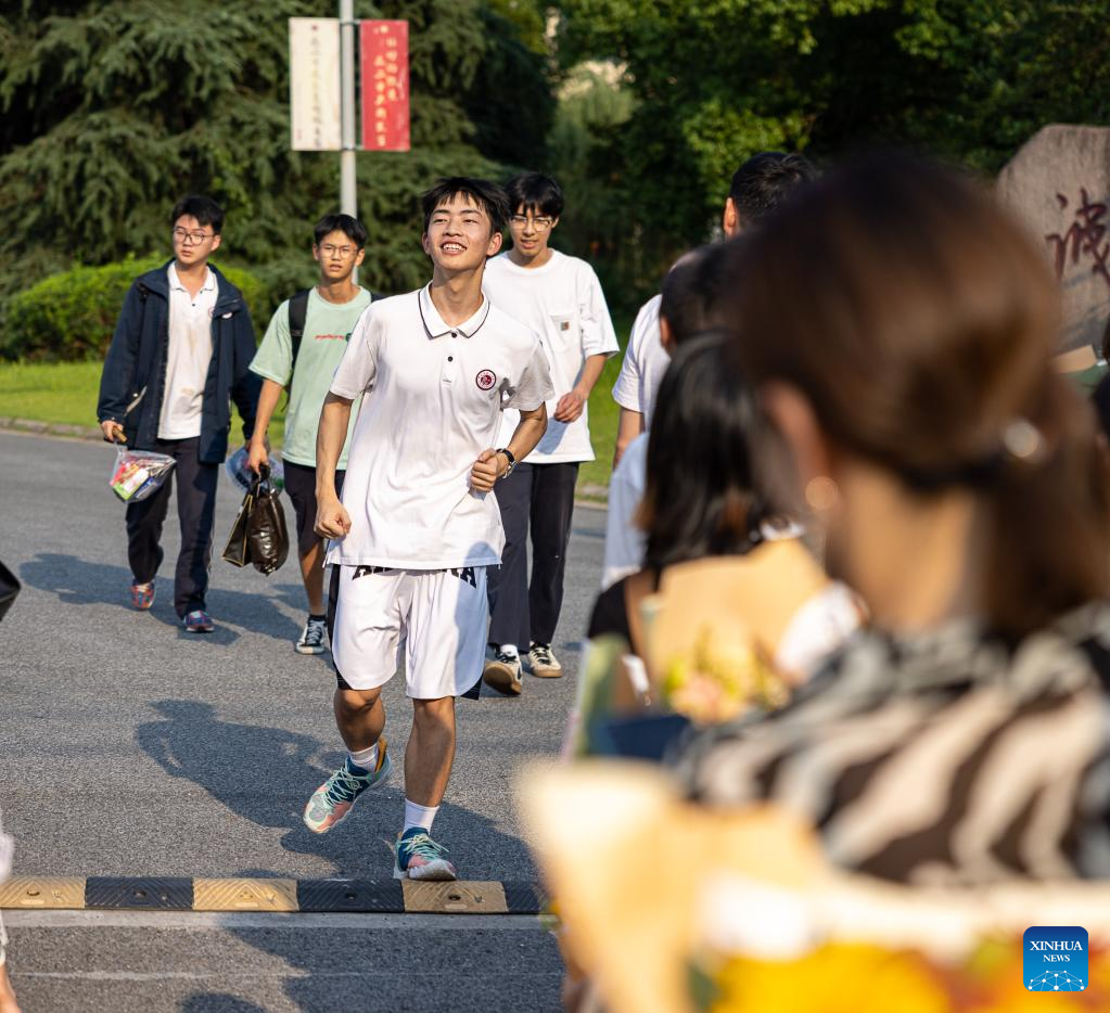 Examinees walk out of an exam site in Huzhou City, east China's Zhejiang Province, June 10, 2023.