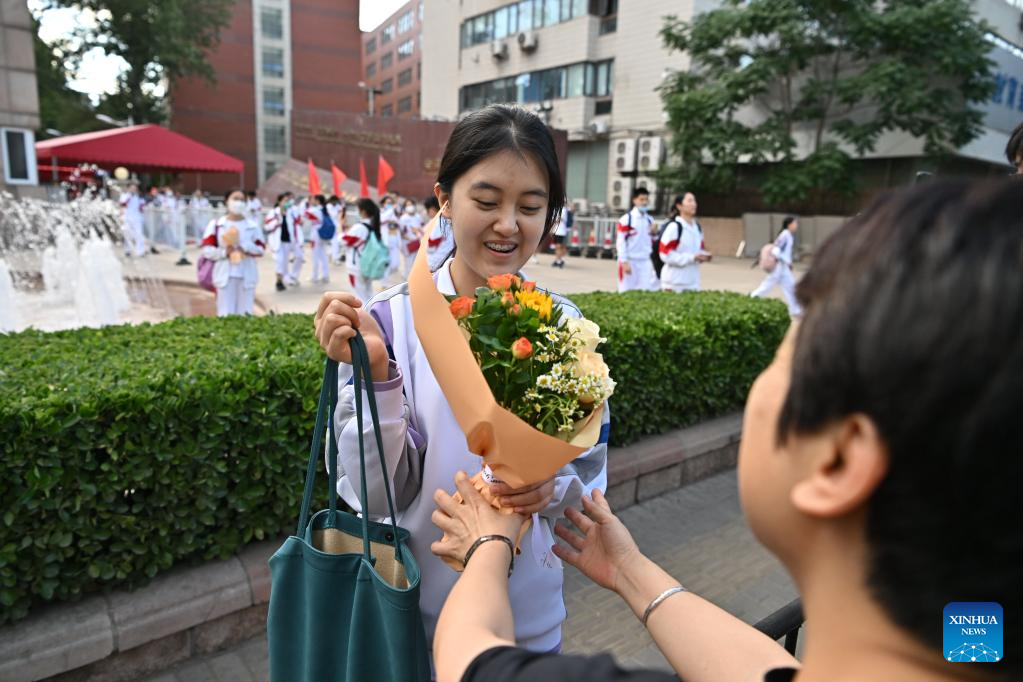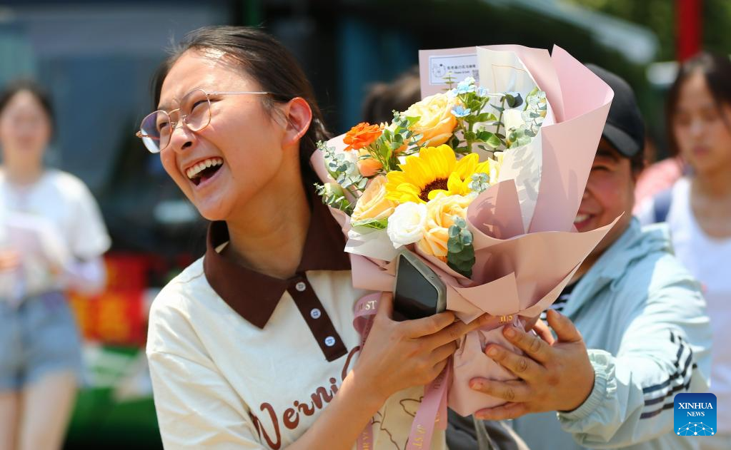 An examinee is presented with flowers at an exam site in Deqing County, east China's Zhejiang Province, June 10, 2023.
