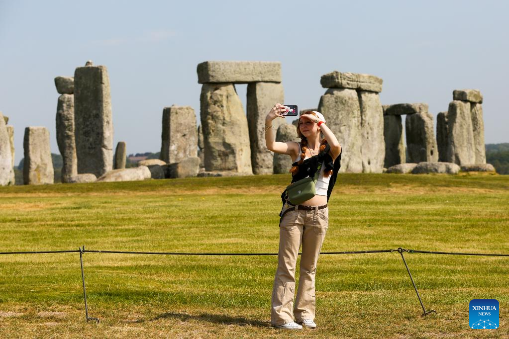 A woman takes a selfie at Stonehenge in Amesbury, Britain, on June 10, 2023. The Stonehenge built in Neolithic Age, is among the most famous groups of megaliths in the world. It was listed as one of the UNESCO World Heritage Sites in 1986. (Xinhua)
